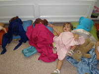 But despite Evie's growing reputation as the "adventurous one", she is also the tender-hearted one of the group. While washing the dishes not long ago, I watched her walk upstairs to her room and reappear moments later holding Hot Tub. She carried him downstairs and walked purposefully into the playroom. A few minutes later, she repeated this same purposeful task with Beer. For the the next half-hour, she walked up and down the stairs, carrying various animals and baby dolls into the playroom. When the dishes where done and my curiosity was at its peak, I stole a glance into the playroom where Evie was lining up the last stuffed animal. Each of them was laying face down on a pillow. As I watched, Evie dug around in the toy box and pulled out a collection of baby blankets. One by one, she covered her animals with a blanket and said, "Night, night!". When she turned around and spotted me, she put her finger to her lips and and said, "Shhhhhhhhh." Then she sang what I think was "Jesus Loves Me" - the song I sing to her every night - walked over to the door, and pulled it shut behind her. "Shhhhhhh," she said again. "They sleeping!"